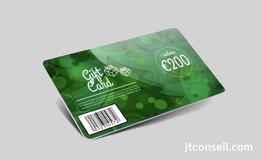Les cartes-cadeaux d’entreprise conçues par jtconseil, expert en marketing digital, offrent de multiples avantages. Elles représentent un outil puissant pour fidéliser les clients et motiver les employés, tout en stimulant les ventes grâce à une visibilité accrue pour votre marque. Optimisées pour le référencement, ces cartes contribuent à améliorer votre notoriété en ligne et à attirer de nouveaux prospects. De plus, elles sont entièrement personnalisables, vous permettant de renforcer votre image de marque de manière ciblée et efficace.
